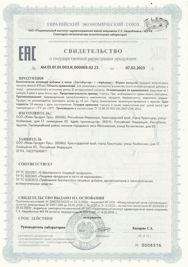 Каждая капсула содержит оптимальную дозу D-аспарагиновой кислоты для стимуляции естественного производства тестостерона, экстракт корня маки перуанской для повышения либидо и улучшения сексуального здоровья, экстракт пажитника для поддержки мышечного синтеза, цитрат цинка, критически важный для поддержания иммунитета и мужской фертильности, и экстракт чёрного перца (Bioperine®) для усиления абсорбции и максимальной биодоступности.